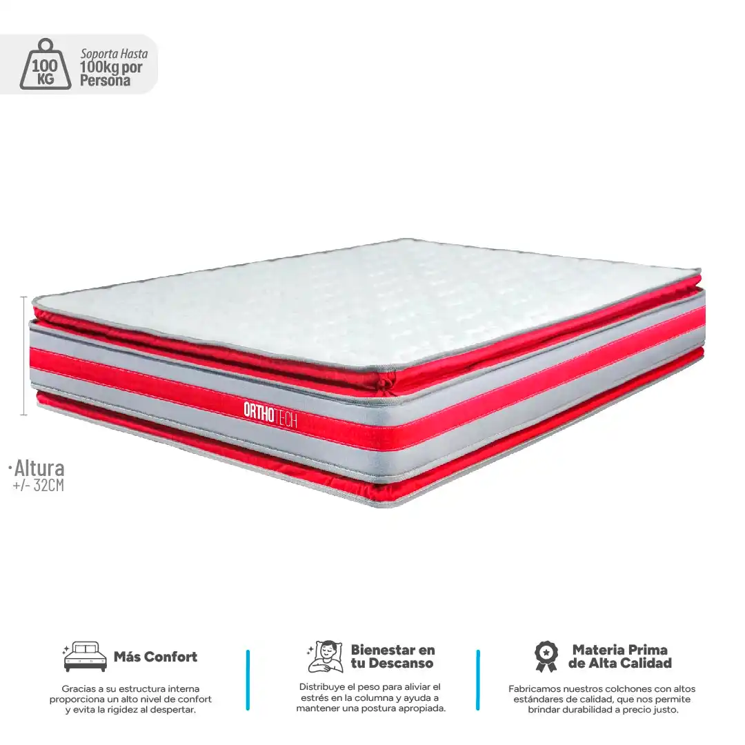 El colchón Ortho Tech con pillow acolchado en ambos lados, su núcleo en espuma de alta densidad permite que el peso de tu cuerpo se distribuya de manera uniforme, mientras que el pillow añade una capa de suavidad y acogida para una sensación de lujo en ambos lados del colchón.