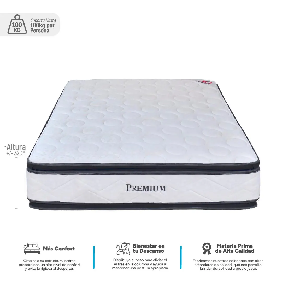 La combinación perfecta entre el confort y la firmeza en un solo lugar, el colchón Premium con pillow en ambos lados es la elección perfecta. Su unidad resortada súper ortopédica brinda un apoyo excepcional para la alineación adecuada de la columna vertebral, mientras que el pillow añade una capa de suavidad y acogida para una sensación de lujo en ambos lados del colchón.